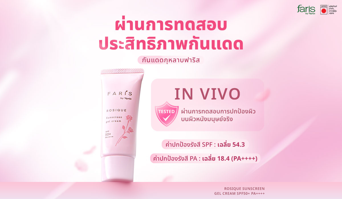 เคยสงสัยไหมว่ากันแดดที่ใช้ทุกวัน “ปกป้องผิวได้จริงหรือไม่”? ลอง กันแดดกุหลาบ FARIS ROSIQUE SPF50+ PA++++ ผ่านการทดสอบ IN VIVO TESTED การันตีได้ว่าปกป้องแสงแดดและรังสี UVA/UVB ได้จริง
